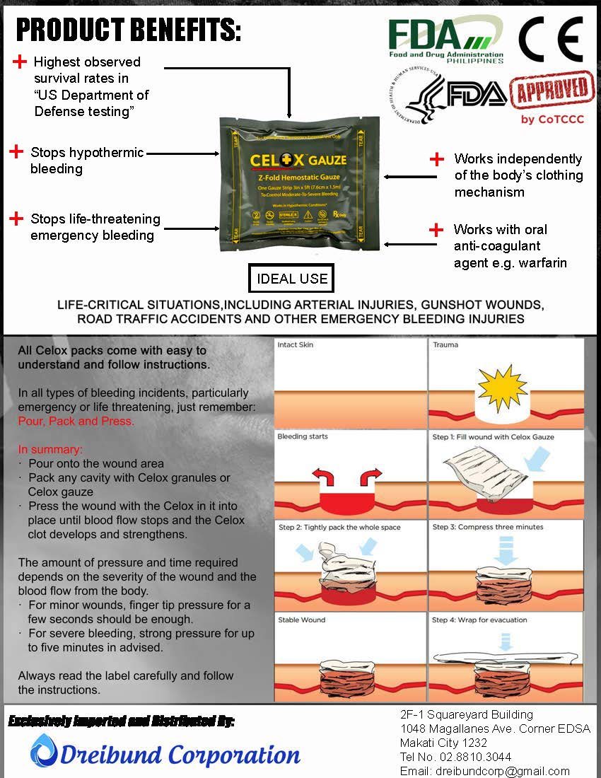 + Celox Gauze is highly effective dressing for hemostasis and is designed to stop bleeding from arterial injuries, gunshot wounds, road traffic accidents and other moderate-to-severe bleeding injuries