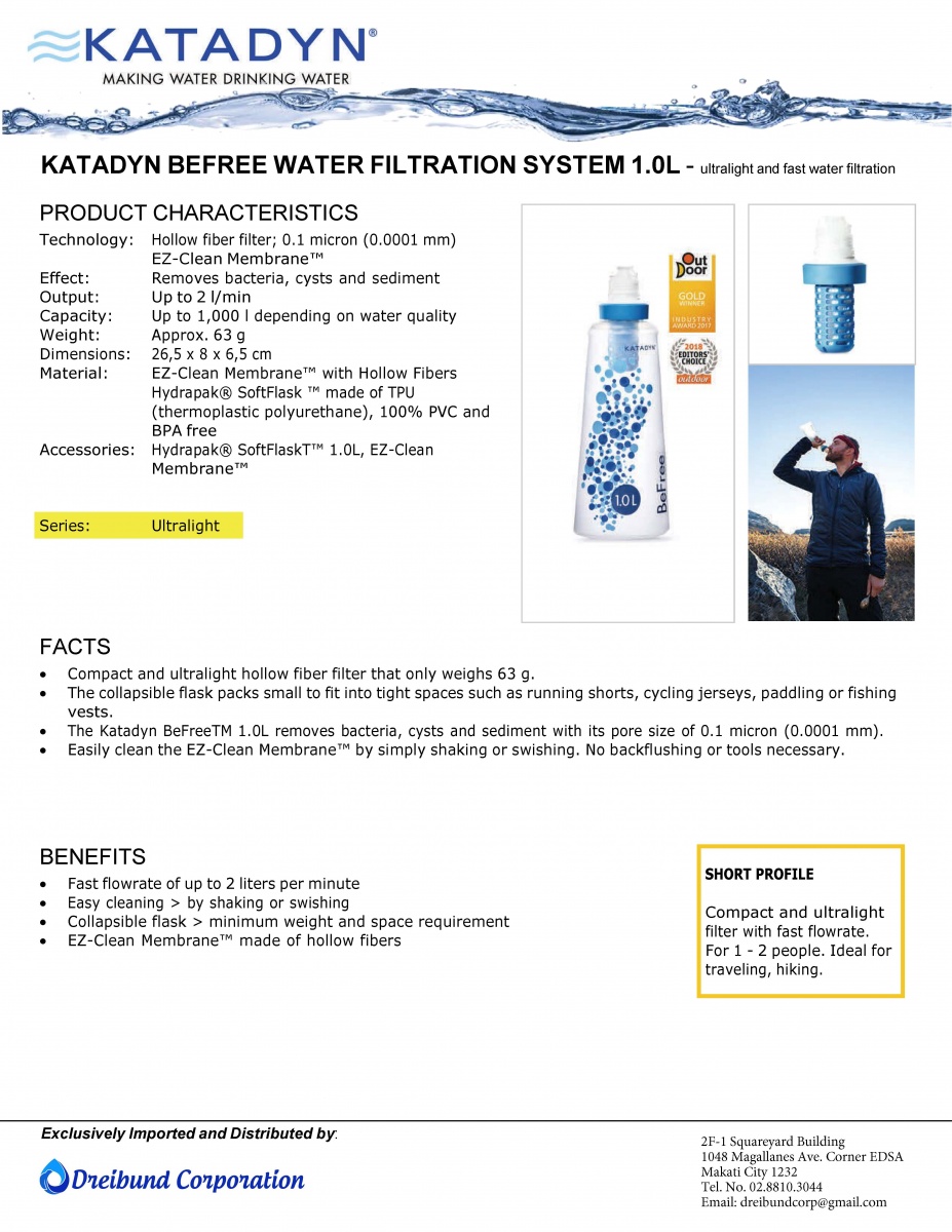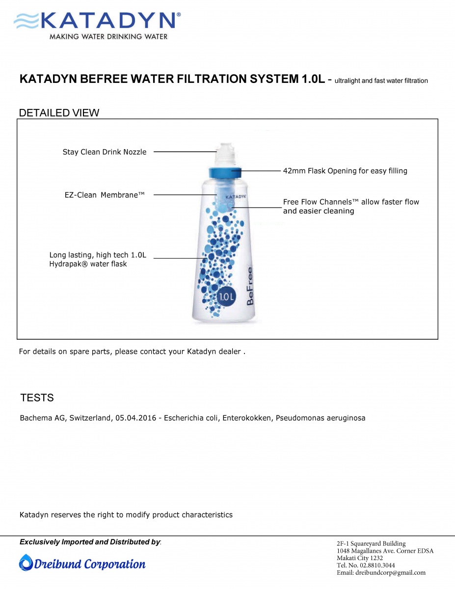 - The Katadyn Be Free 1.0L removes bacteria, cysts and sediment with its pore size of 0.1 micron (0.0001 mm).