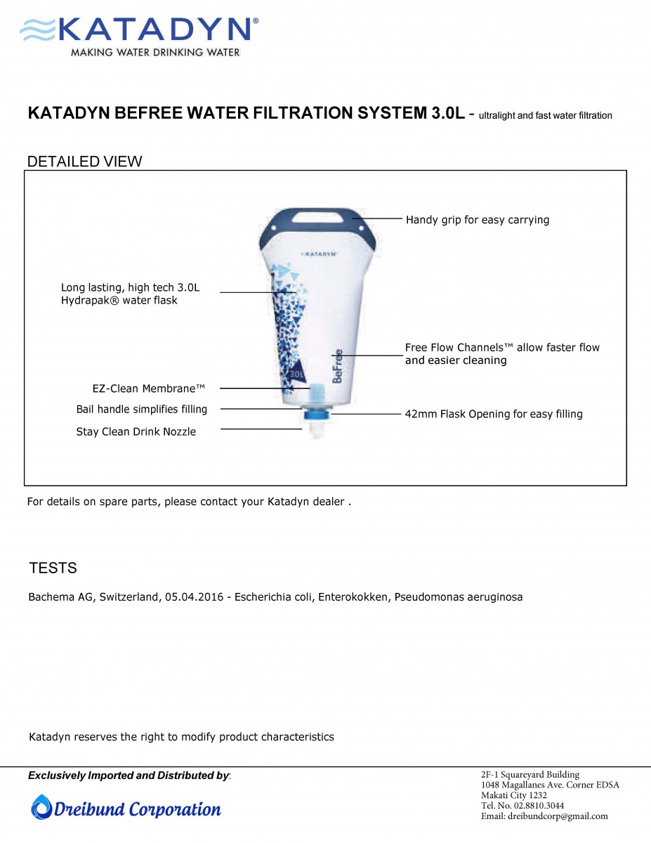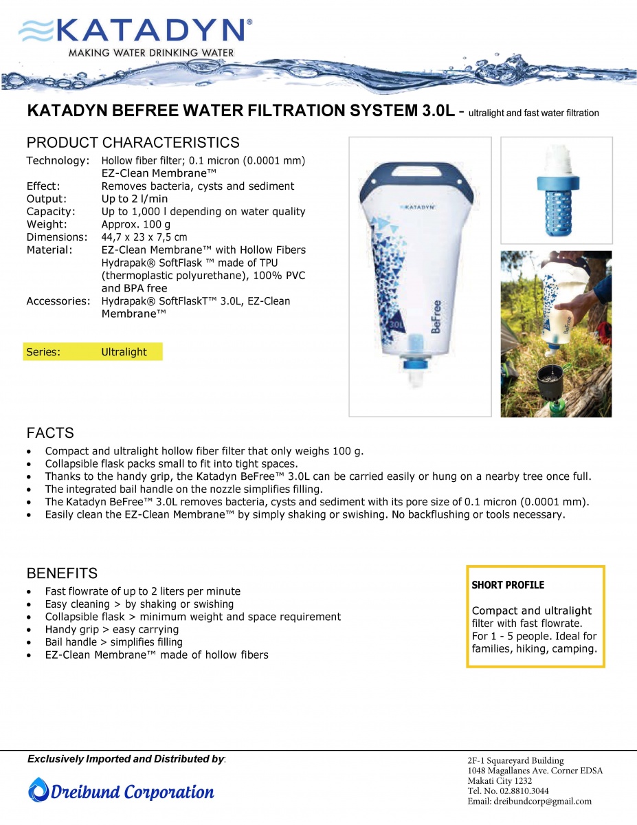 - The Katadyn Be Free 3.0L removes bacteria, cysts and sediment with its pore size of 0.1 micron (0.0001 mm).